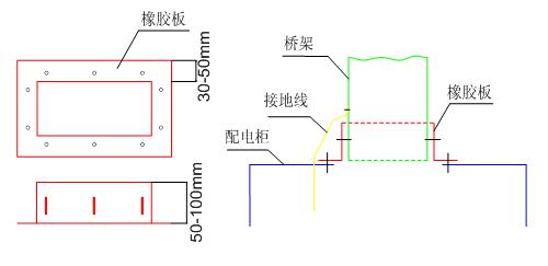配电柜安装完毕后,安装柜上方的的桥架。配电柜进出电缆开孔方位由供货方按规范预留。电缆敷设完毕后封闭。桥架与柜内接地母排用专用接地线可靠接地。桥架与配电箱(柜、联接处选用橡胶板联接,以保护导线和电缆,桥架与配电柜联接见图。